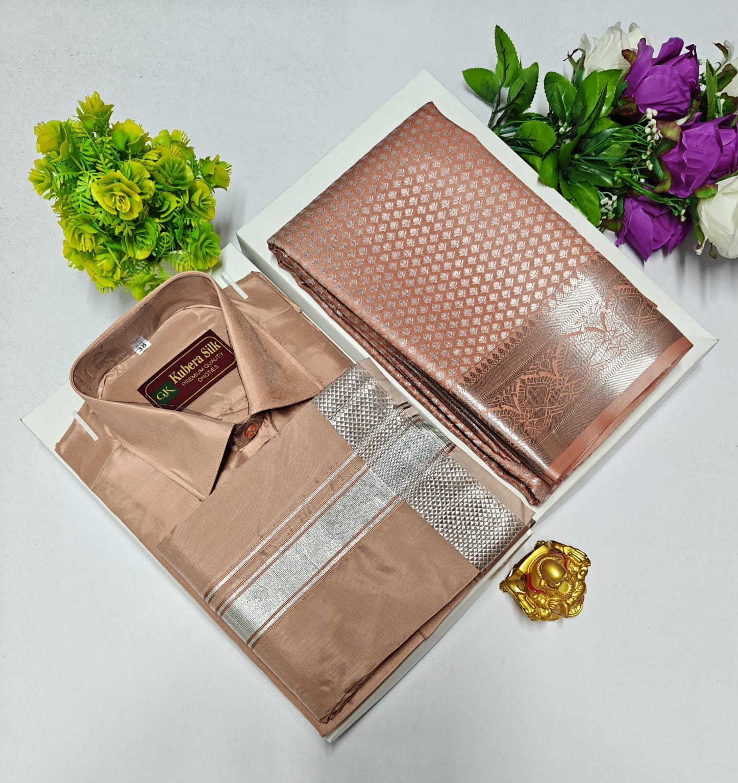 Silk Material Mixed Shirt, Dhothi and Saree matching set